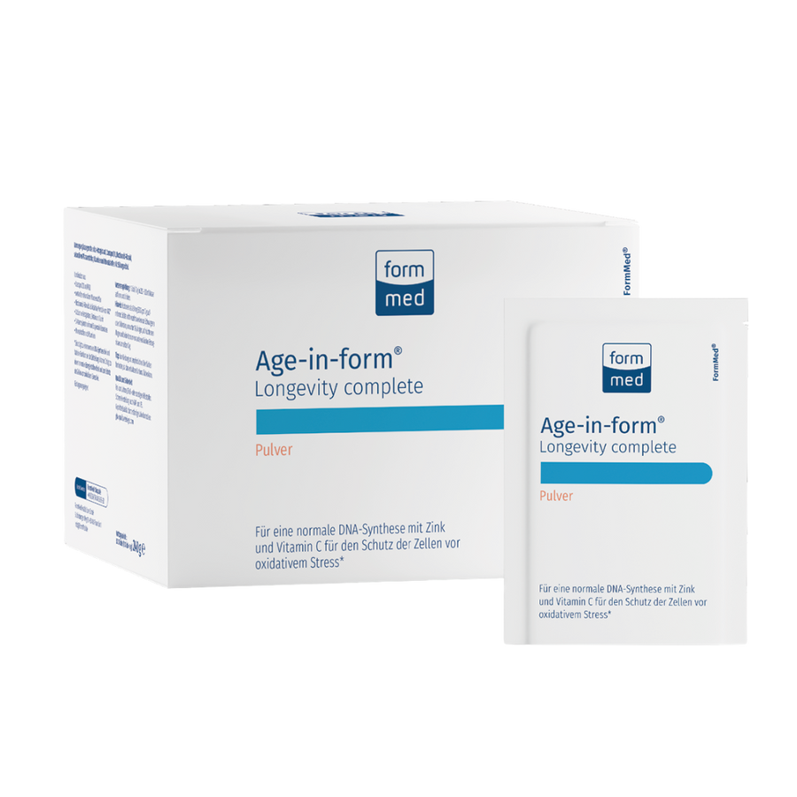 Age-in-form® Longevity complete is an easy-to-take powder that offers a high-dose and broad combination of 22 specific active ingredients - including nicotinamide riboside, alpha-ketoglutarate, PQQ (pyrroloquinoline quinone), betaine and spermidine, for example, curcuminoids, green tea EGCG, and resveratrol and quercetin. Zinc contributes to normal DNA synthesis and has a function in cell division, while vitamin C supports the protection of cells against oxidative stress - both are important for longevity. The high-quality wheat germ extract has a high content of spermidine, the zinc is contained as an alkaline citrate - just two examples of the scientific quality of FormMed.