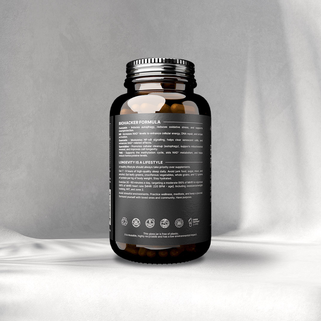 Unlock your body's potential for vitality and longevity with the Biohacker Formula — a synergistic blend of 5 clinically researched compounds: Curcumin, Quercetin, NR, Spermidine & TMG. See below for full product details.